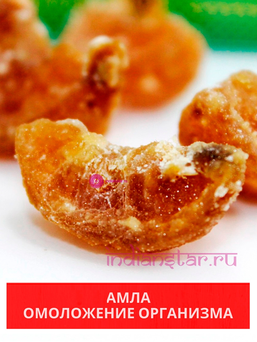 Амла засахаренная – это натуральный деликатес, который изготовлен по старинному индийскому рецепту. Плоды амлы, известной также как индийский крыжовник, являются одними из самых полезных в мире. Эти чудесные ягоды - настоящий кладезь витамина С. В одной такой ягоде содержится до 3000 мг витамина, что в 20 раз больше, чем в апельсине. За счет своих вяжущих свойств амла удерживает в организме все полезные микроэлементы и способствует их усвоению. Амла высоко ценится в Аюрведе как мощнейший природный антиоксидант и иммуномодулятор. В качестве средства омоложения амла входит во все аюрведические тоники и также является основным компонентом знаменитого «Чаванпраша» и очищающего препарата «Трифалы».