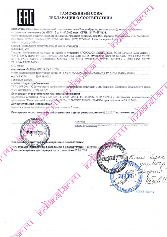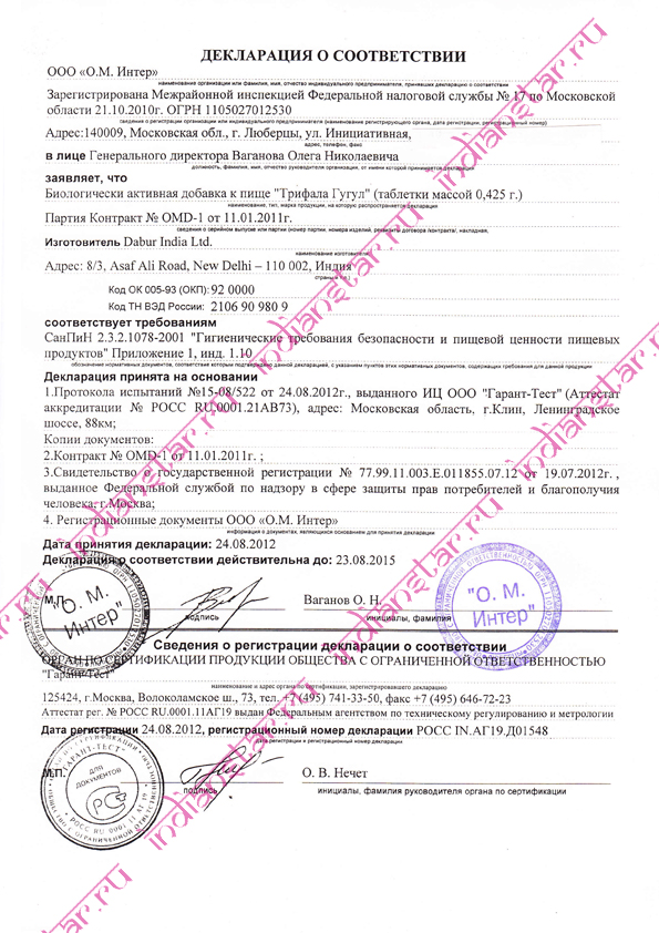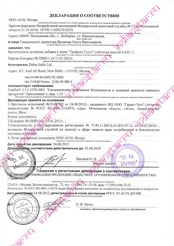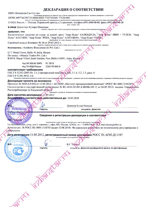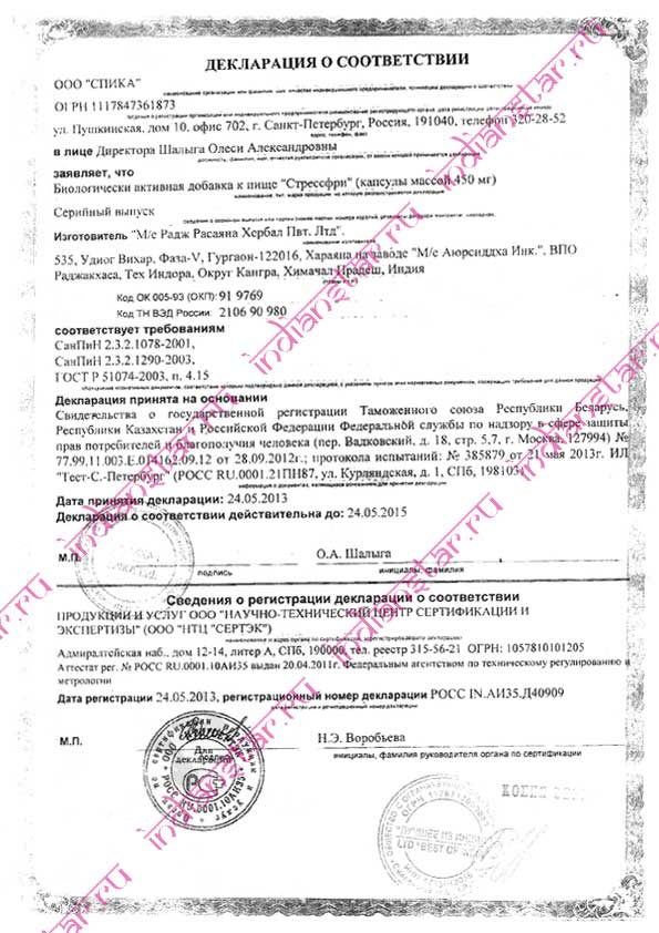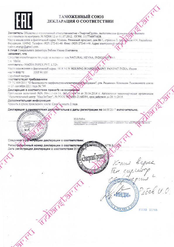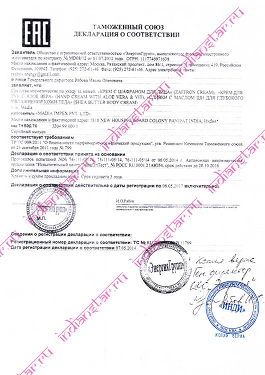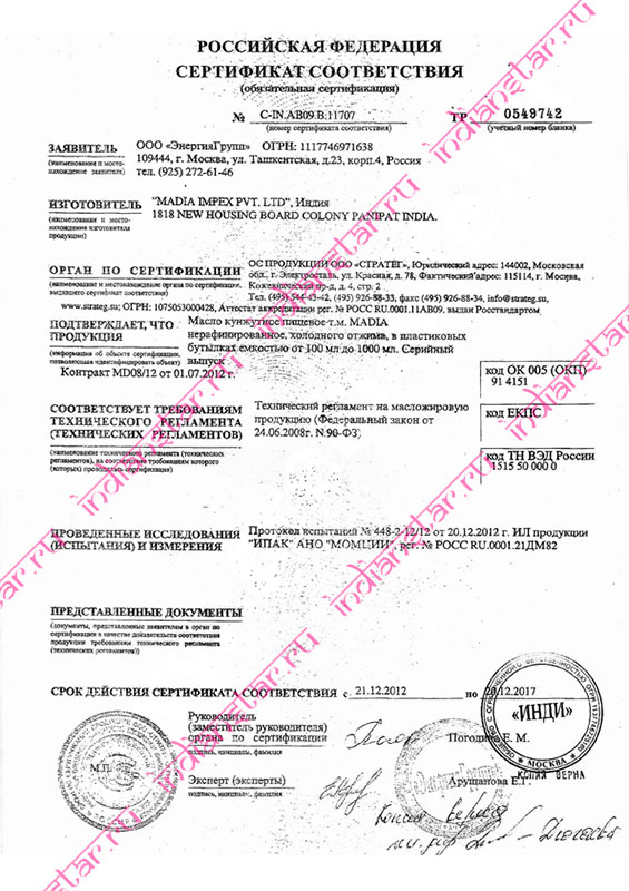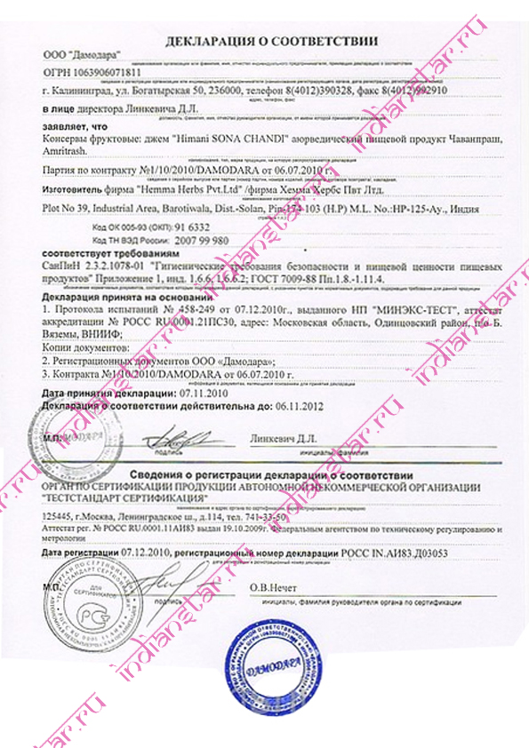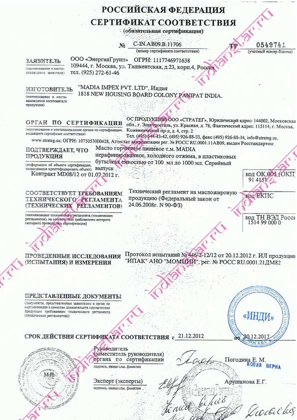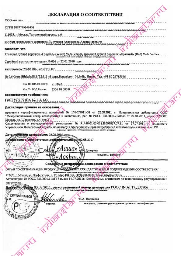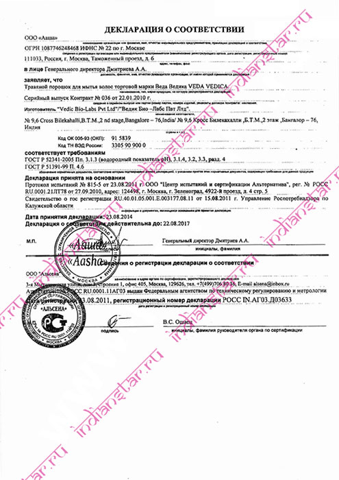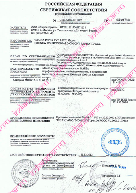 Сертификаты международных стандартов получают и хранят у себя производители продукции в Индии, информацию о наличии таких сертификатов можно найти информацию на упаковке товара. Российские сертификаты представлены на данной странице.