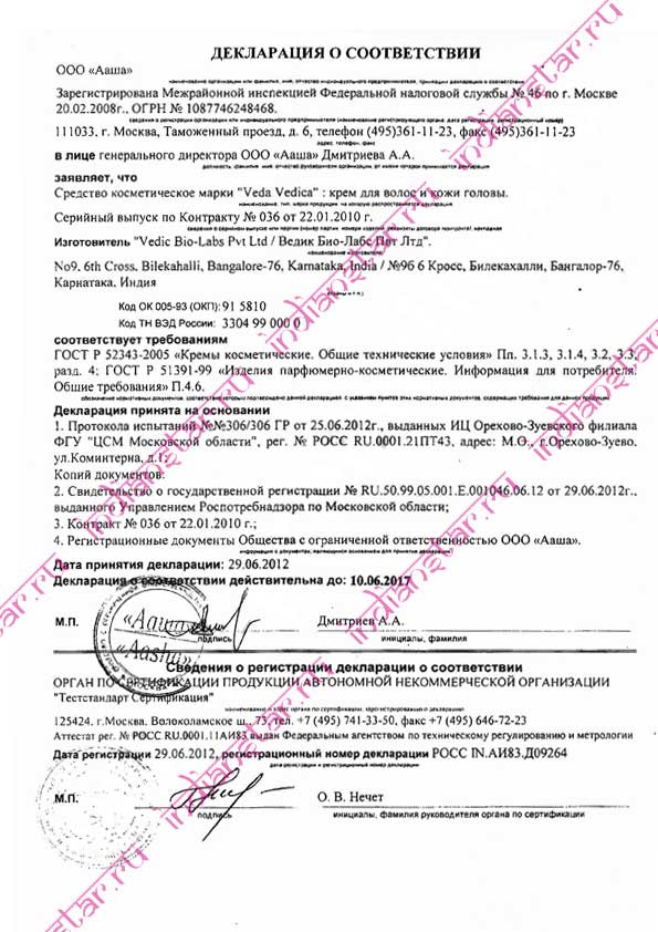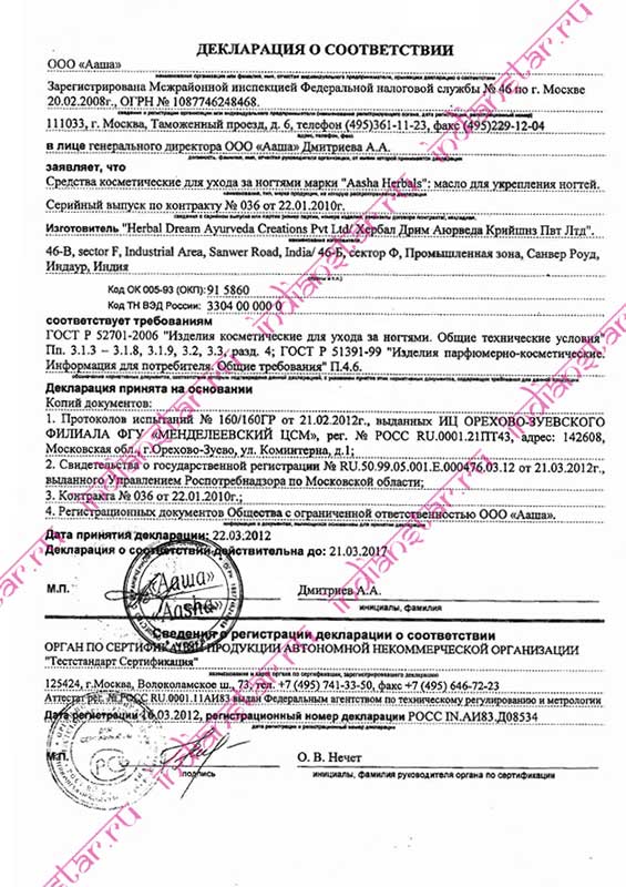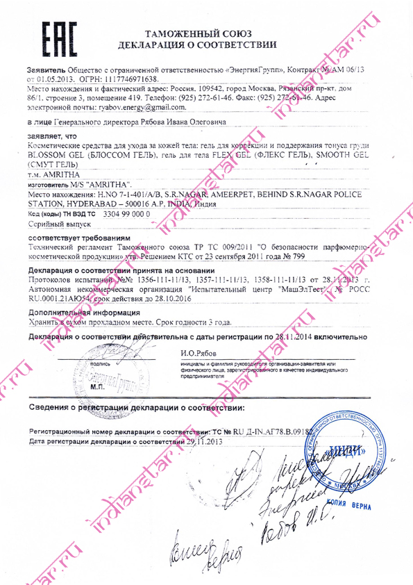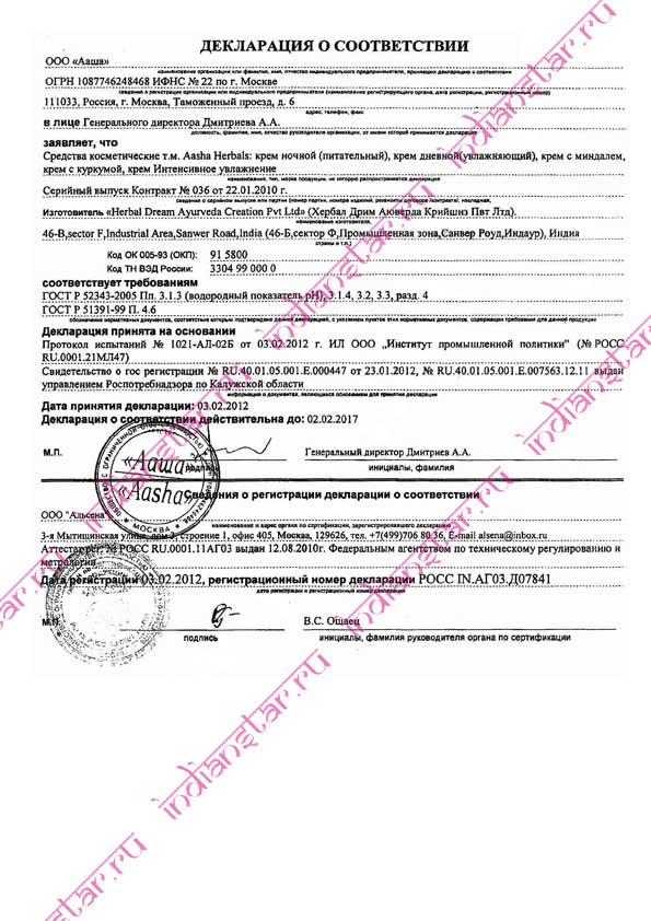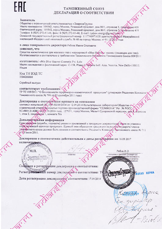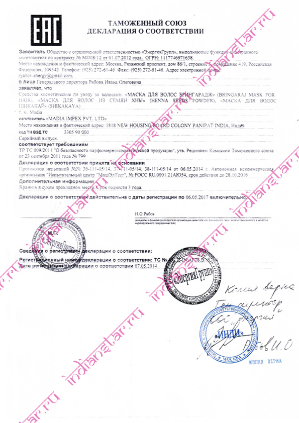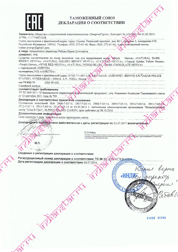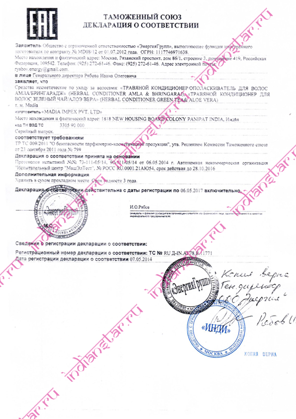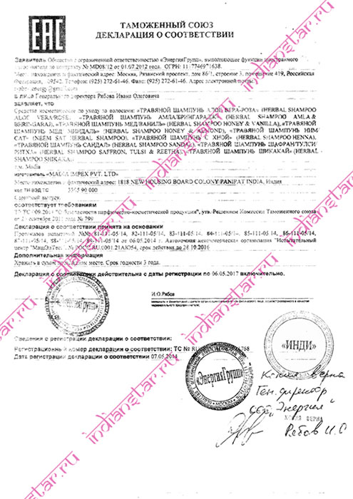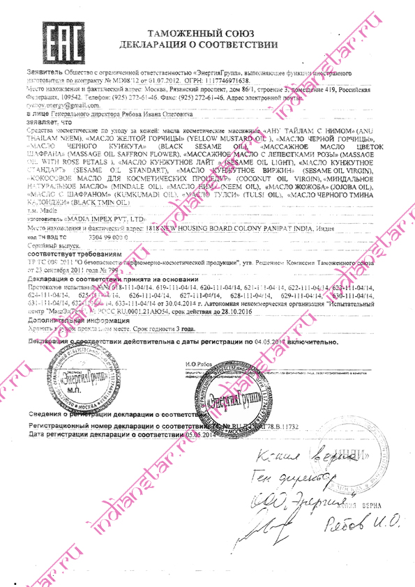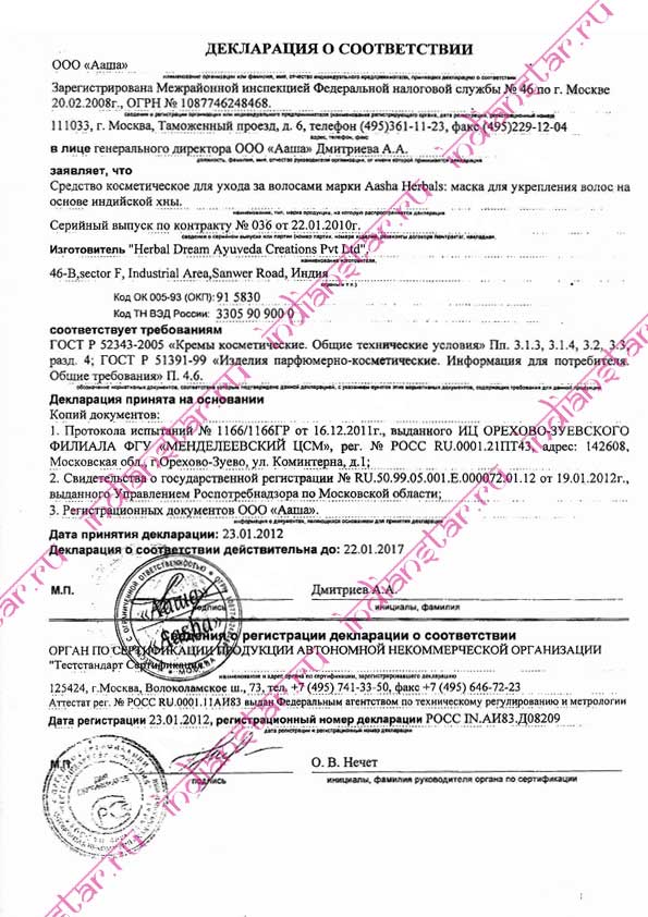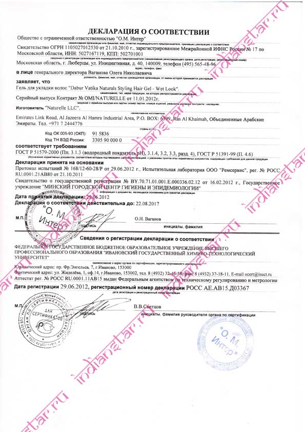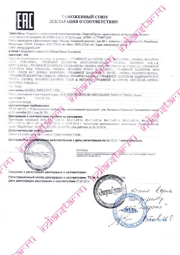 Сертификаты международных стандартов получают и хранят у себя производители продукции в Индии, информацию о наличии таких сертификатов можно найти информацию на упаковке товара. Российские сертификаты представлены на данной странице.