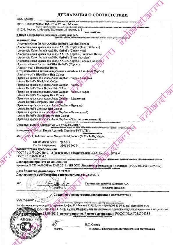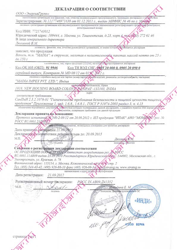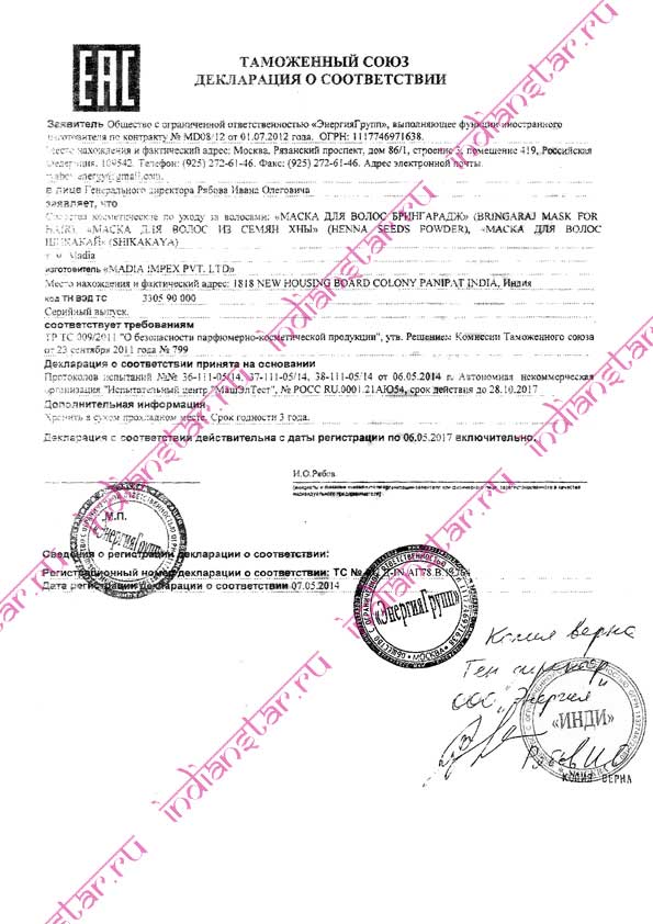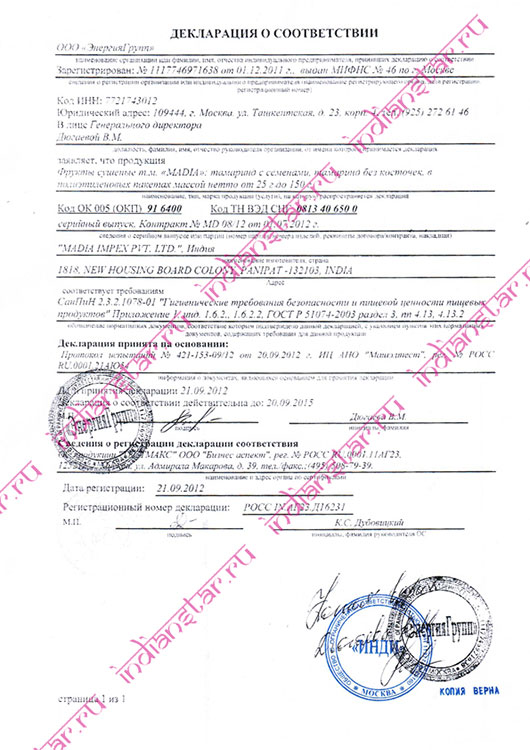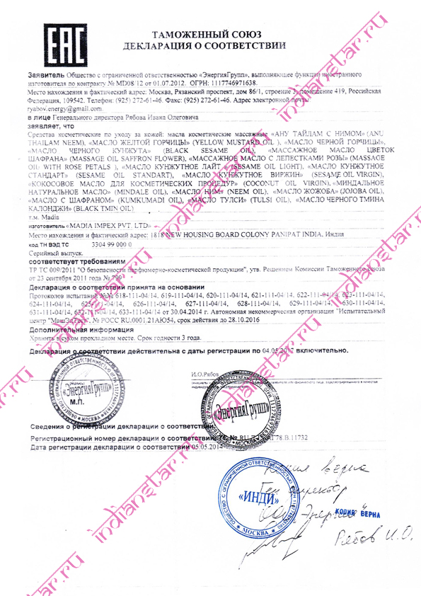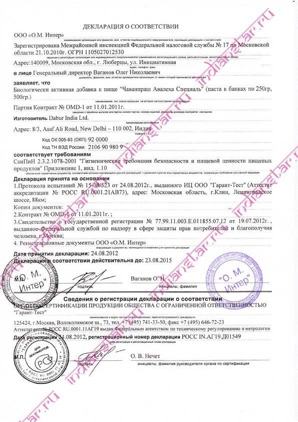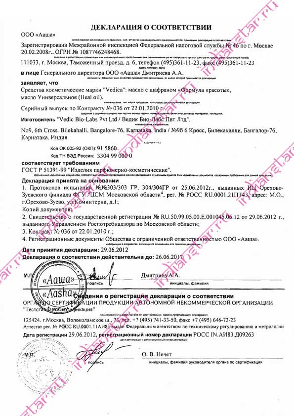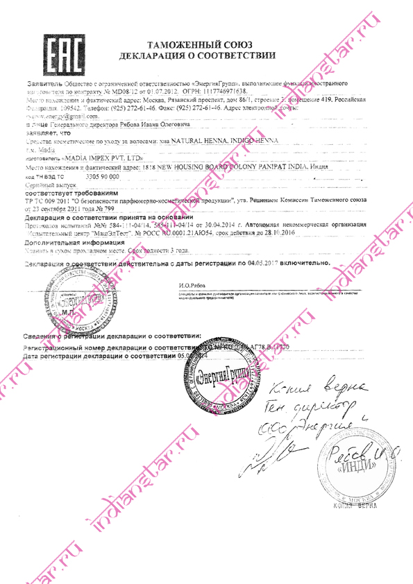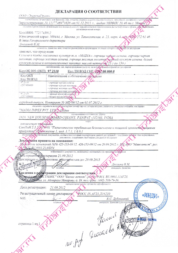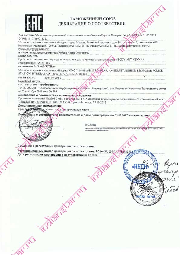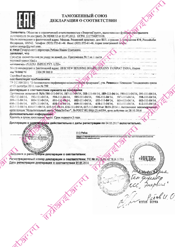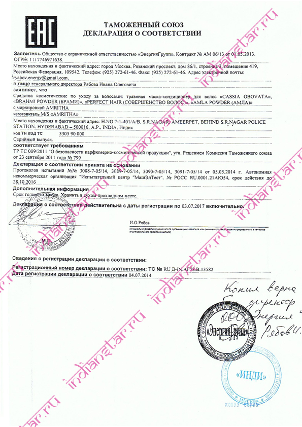 Сертификаты международных стандартов получают и хранят у себя производители продукции в Индии, информацию о наличии таких сертификатов можно найти информацию на упаковке товара. Российские сертификаты представлены на данной странице.