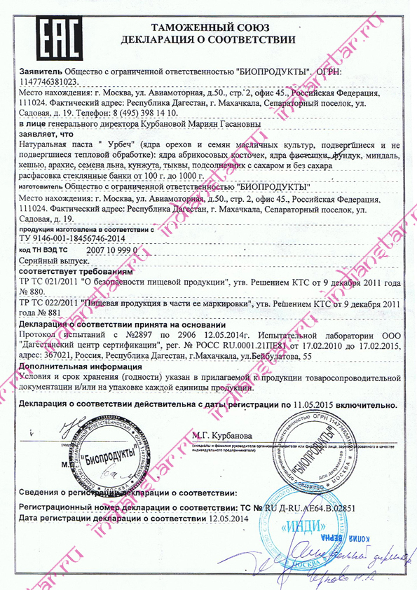 На данный момент, согласно Федеральному закону №184-ФЗ от 27.12.2002 "О Техническом регулировании" и принятом на его основании Постановлением Правительства Российской Федерации от 01.12.2009 г. №982, обязательная сертификация БАДов (Биологически Активных Добавок) и продуктов питания не предусмотрена.