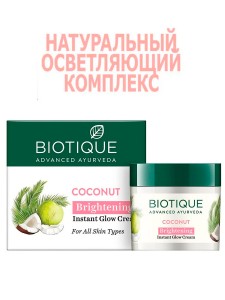 Нежный крем с кокосовой водой, экстрактами лимона и одуванчика. Питает, увлажняет, слегка осветляет кожу.